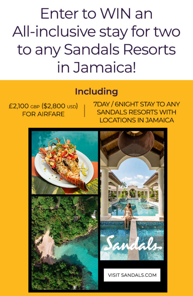 - THE PRIZE: One (1) prize consisting of a seven-days/six-nights All-Inclusive vacation for two (2) adults (the prize winner + an adult guest) to any one of Sandals Resorts listed below located in Jamaica (the “Sandals Resorts Prize Package”).